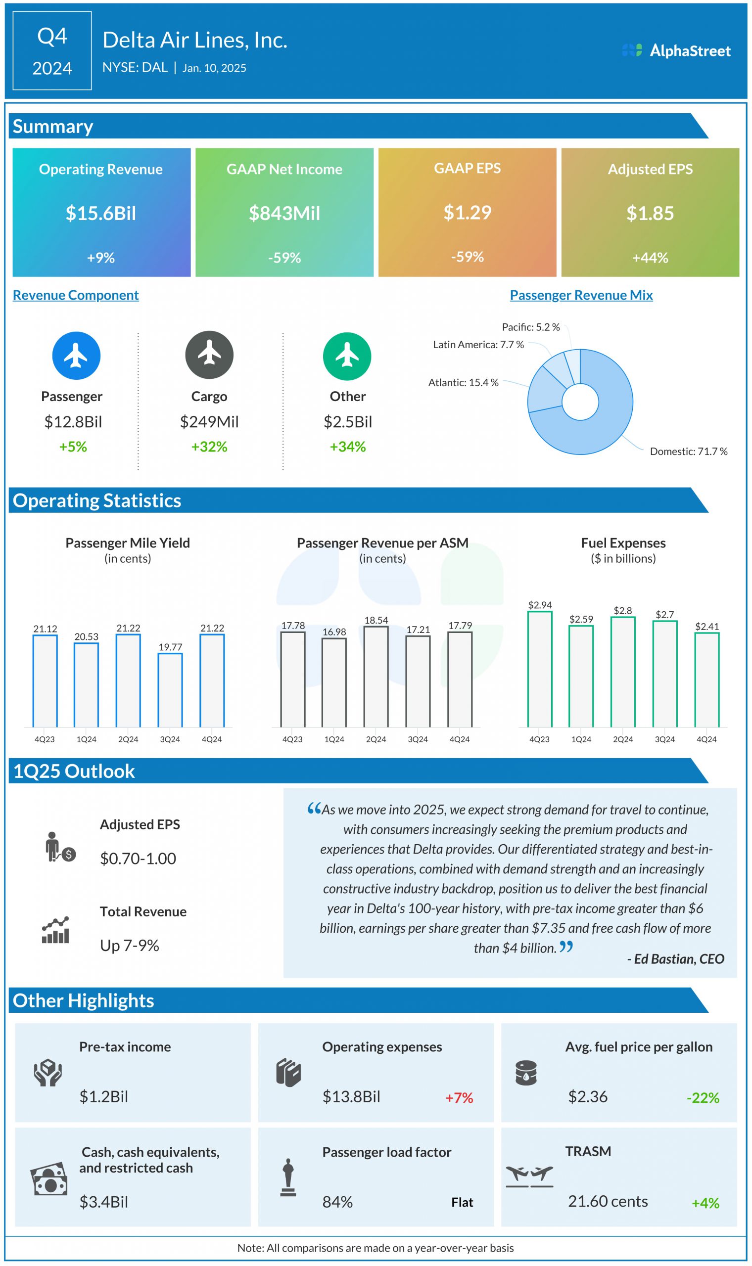 Delta has guided for total revenue to range between $13.9-14.1 billion in Q1 2025. Analysts are projecting revenue of $13.93 billion for the first quarter, which implies a growth of over 1% from the same period last year. In the fourth quarter of 2024, total operating revenue increased 9% year-over-year to $15.6 billion.