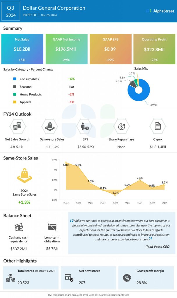 Analysts are projecting revenue of $10.26 billion for Dollar General in Q4 2024, which indicates a growth of 4% from the same quarter a year ago. In the third quarter of 2024, net sales increased 5% year-over-year to $10.2 billion.