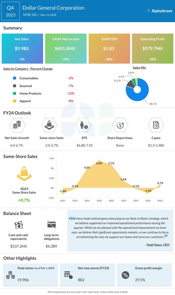 Dollar General expects same-store sales to increase 1.5-2.0% in Q1 2024. In the fourth quarter, same-store sales rose 0.7%, driven by growth in customer traffic, partly offset by a drop in average transaction amount. Last quarter, same-store sales grew in the consumables category but declined across the seasonal, apparel, and home products categories.