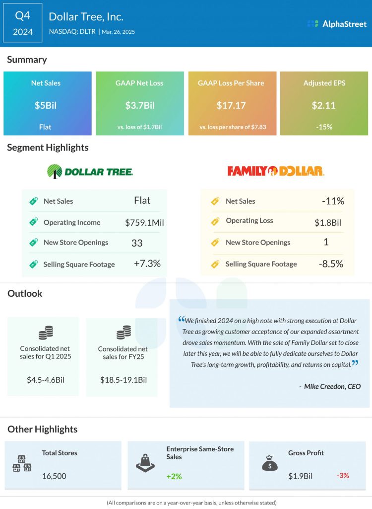 Dollar Tree has guided for revenues of $4.5-4.6 billion for the first quarter of 2025. Analysts are projecting revenues of $4.53 billion for the period. This signals a drop of over 40% from the same quarter a year ago. In the fourth quarter of 2024, revenues remained relatively unchanged year-over-year at $5 billion.