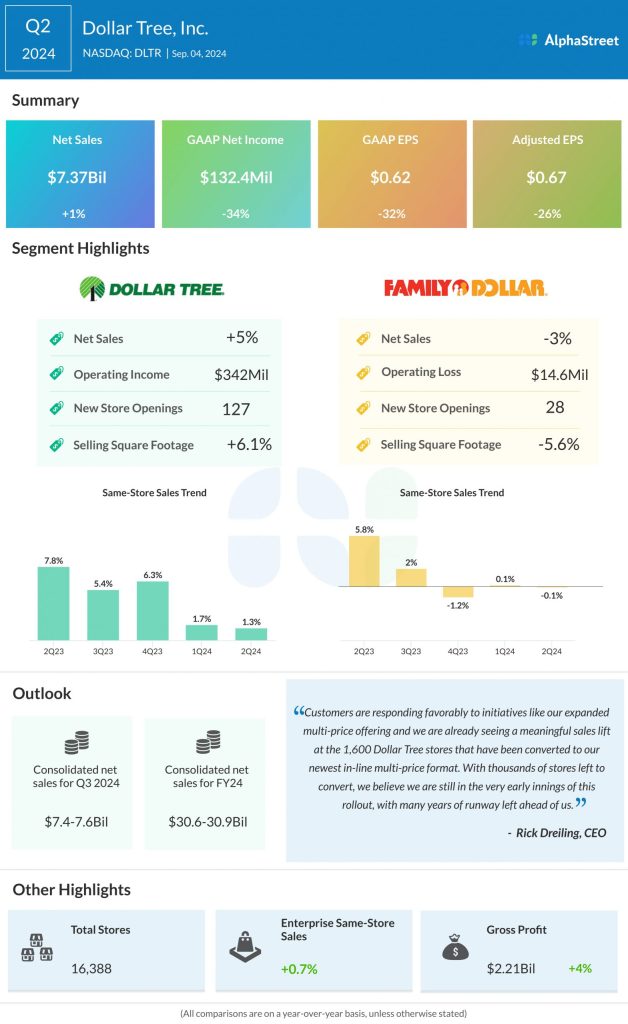 Dollar Tree expects Q3 2024 comparable store sales to grow in the low-single-digits for both the enterprise and its two segments. In an update earlier this month, the company stated that same-store sales tracked well through the quarter. In Q2, enterprise same-store sales grew 0.7%. Same-store sales increased 1.3% for the Dollar Tree segment but fell 0.1% for the Family Dollar segment.