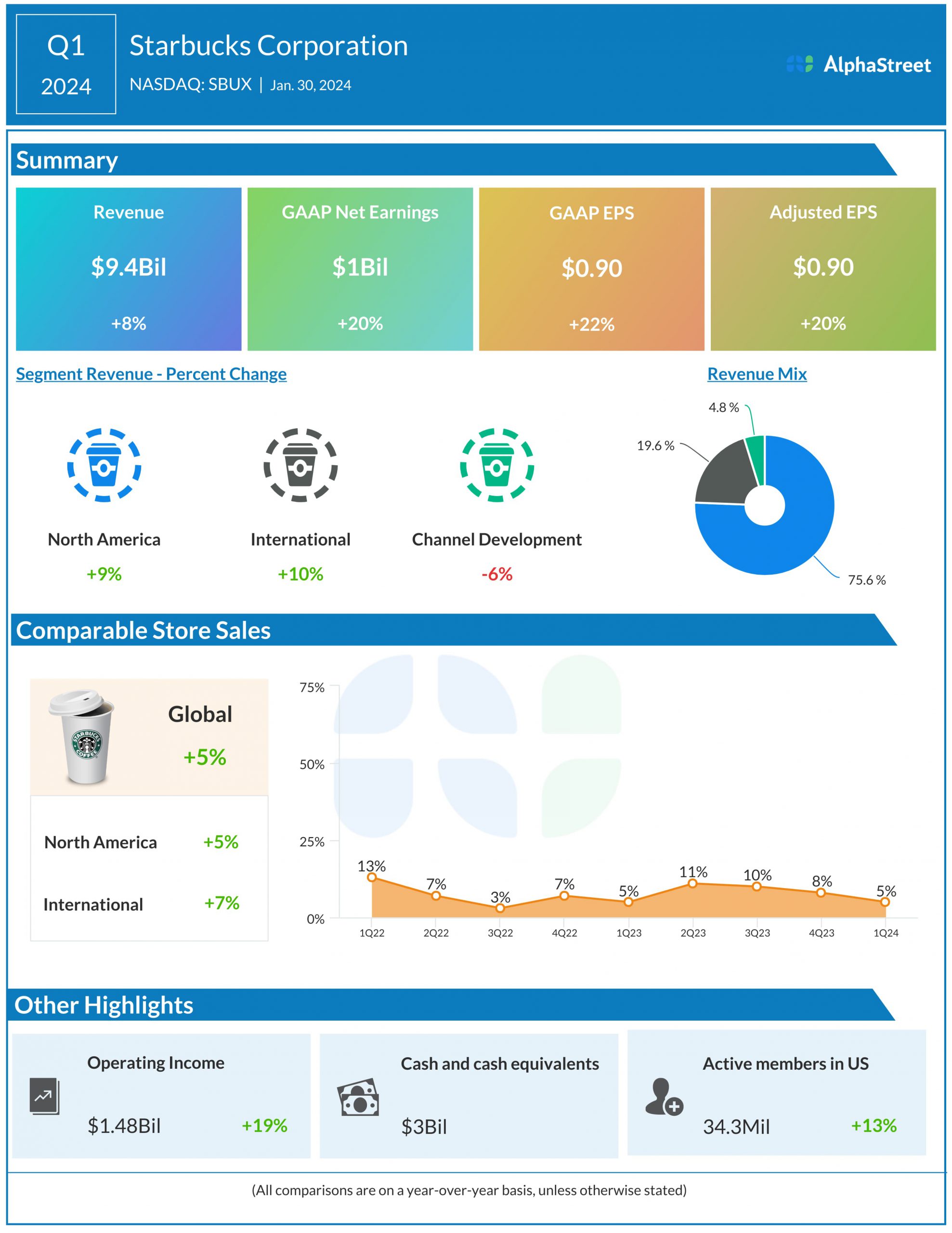 Analysts are projecting revenue of $8.6 billion for Starbucks in the second quarter of 2024. This compares to revenue of $8.7 billion reported in the same quarter last year. In the first quarter of 2024, revenues increased 8% year-over-year to $9.4 billion.