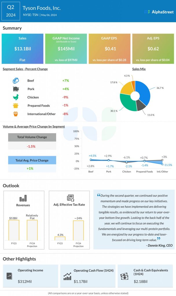 For the second quarter, the company reported total sales of $13.07 billion, which is broadly unchanged from the comparable quarter last year. An increase in the sales of beef and pork was offset by a slowdown in the other categories. It posted earnings of $0.62 per share for the quarter, on an adjusted basis, compared to a loss of 0.04 per share in Q2 2023. On a reported basis, net profit was $145 million or $0.41 per share during the three months, vs. a loss of $97 million or $0.28 per share in the prior-year quarter.