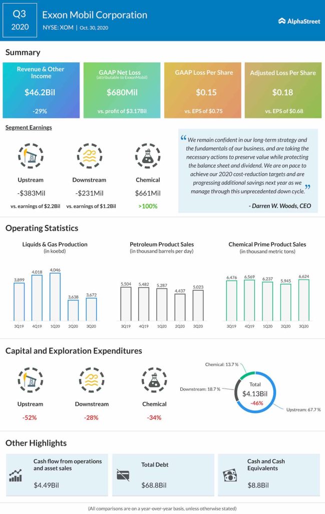 The company slipped to a loss of $0.18 per share in the third quarter, on an adjusted basis, as revenues plunged 29% to $46.2 billion. Though liquid realizations grew sequentially, aided by better prices and improved demand, that was more than offset by dismal gas realizations.