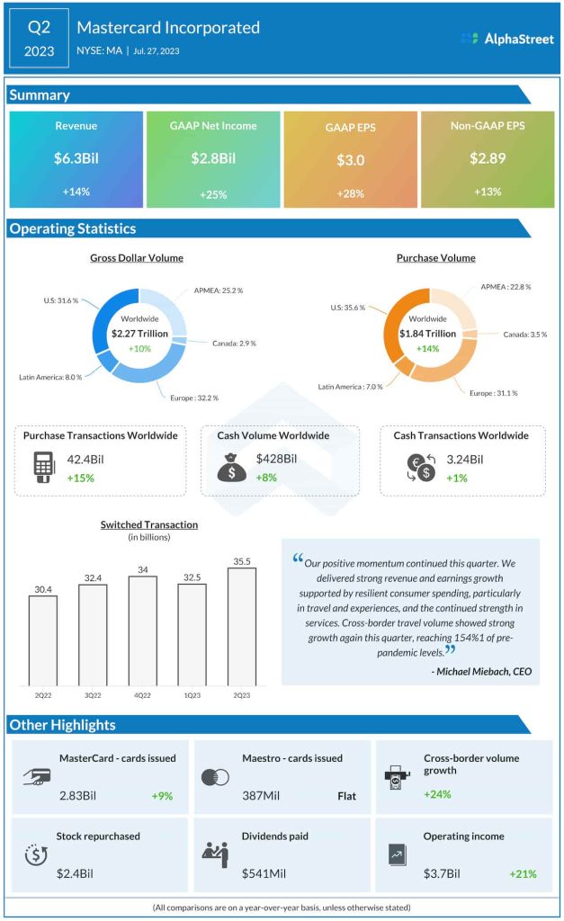 Mastercard’s earnings topped expectations for the fourth time in a row. In the second quarter of 2023, revenues also exceeded estimates, rising 14% year-over-year to $6.3 billion. Consequently, there was a 13% increase in adjusted earnings to $2.89 per share. Worldwide gross dollar volume and purchase volume increased by 10% and 14% respectively.