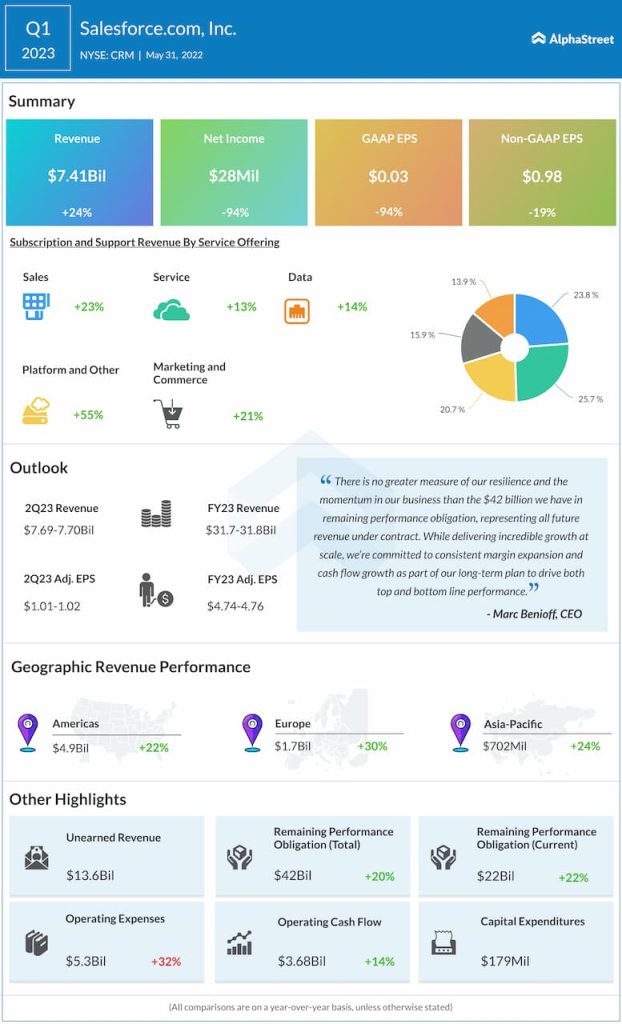 Encouragingly, the adverse economic conditions have not slowed down the ongoing digital transformation, which bodes well for Salesforce. The company’s growing partner network and broad-based growth across geographical regions benefited from the digital boom. After the acquisition of MuleSoft, Tableau, and more recently Slack, Salesforce is better positioned now to grow the business and explore new revenue streams.