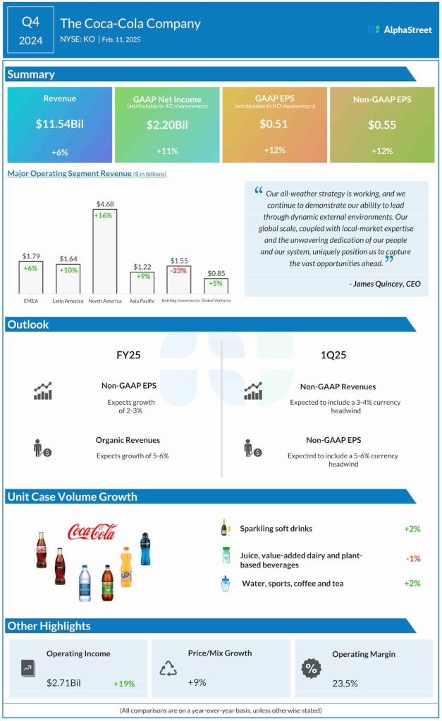 In Q4 2024, Coca-Cola’s adjusted EPS rose to $0.55 from $0.49 in the comparable period in the prior year. Unadjusted net income was $2.20 billion or $0.51 per share in Q4, compared to $1.97 billion or $0.46 per share in the year-ago period. The positive top-line performance reflects a 6% year-over-year increase in revenues to $11.54 billion. Continuing the long-term trend, both profit and the top line beat Wall Street’s estimates.