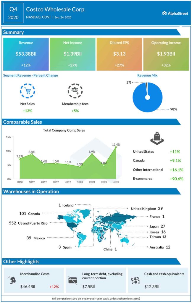 Costco’s earnings exceeded expectations regularly in recent times, though with a few exceptions, and the trend continued in the final three months of 2020. At $1.4 billion, net profit was up 27% from the year-ago quarter, while revenues surged to more than $53 billion reflecting double-digit growth in merchandise sales. Comparable store sales grew at a record rate of 11.4% and there was a 91% growth in e-commerce sales.