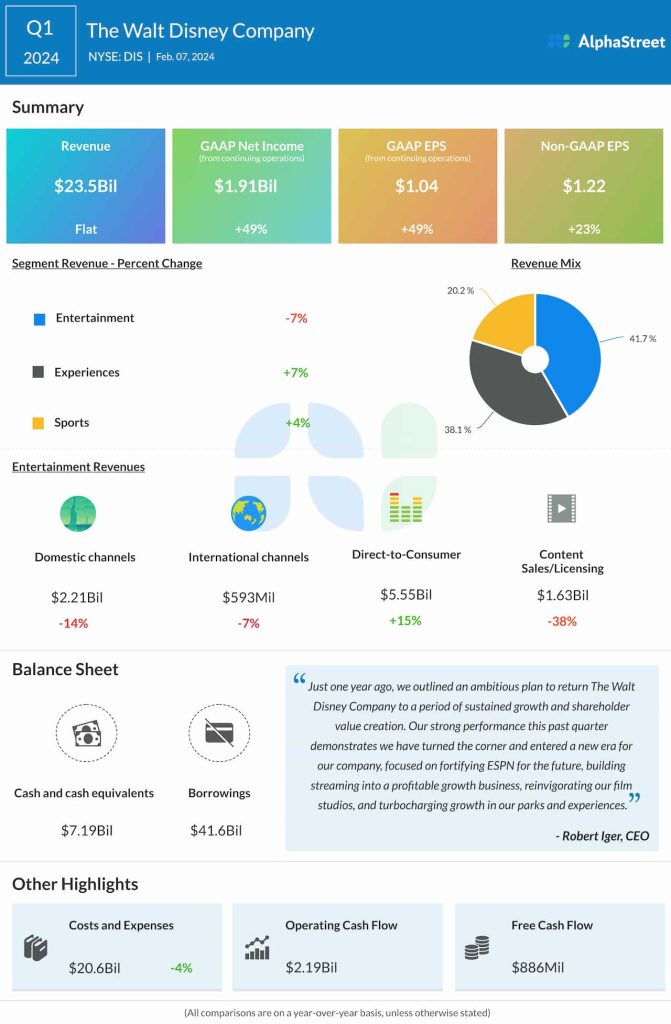 In the core Entertainment division, double-digit growth in the direct-to-customer business was more than offset by weakness in the other platforms. Overall, margins benefited from a decrease in operating costs, thanks to the management’s cost-cutting efforts. Though Disney+ witnessed a drop in subscriber numbers, revenues increased due to higher fees.