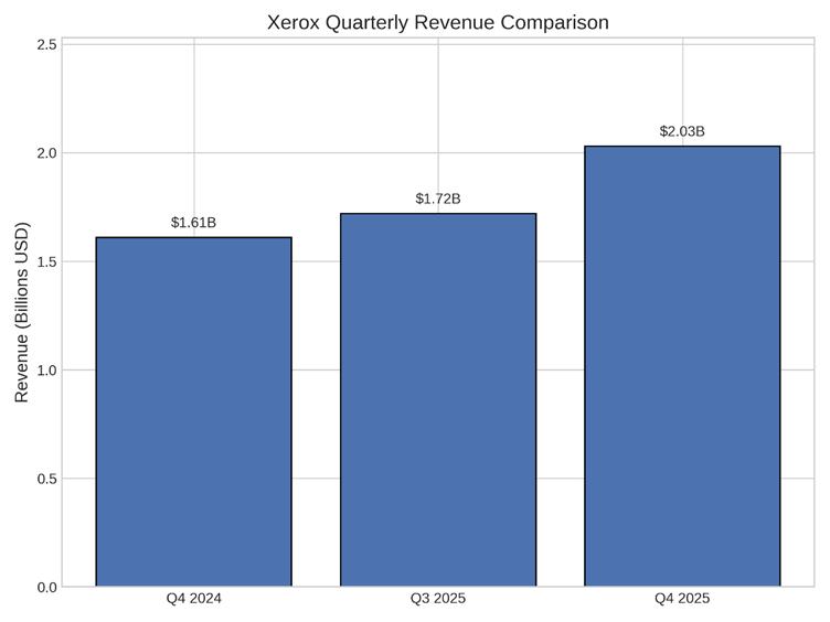 Xerox Holdings Corp. (NASDAQ: XRX) reported results for the fourth quarter of fiscal year 2025 on Thursday, showing higher revenue but deeper losses compared with the year-ago period. Revenue for Q4 2025 was $2.03 billion, up 25.7% from $1.61 billion in the fourth quarter of fiscal 2024. The company reported a GAAP net loss of $73 million, or $0.60 per share, compared with a net loss of $21 million, or $0.20 per share, in the year-ago quarter. Adjusted net loss was $8 million, or $0.10 per share, versus adjusted net income of $49 million, or $0.36 per share, in the prior year.
