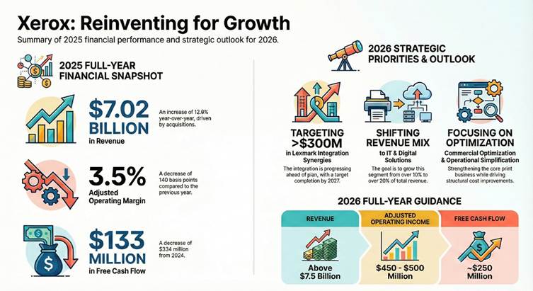 Xerox provided outlook commentary tied to fiscal year 2026, indicating expectations for continued revenue growth and improved profitability. The company reaffirmed its strategy to expand higher-margin services and solutions while optimizing cost structures. Management reiterated that macroeconomic conditions and enterprise spending trends would continue to shape demand for office and IT services.
