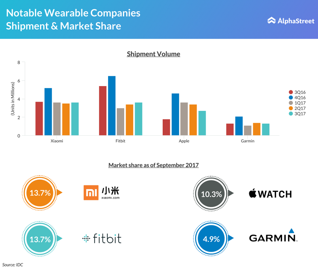 According to the International Data Corporation, the overall wearables market is expected to grow from 113.2 million shipments in 2017 to 222.3 million in 2021 with a compound annual growth rate of 18.4%. Based on the third quarter shipment performance, the top spot of wearable vendors has been shared by both Xiaomi and Fitbit, followed by Apple.