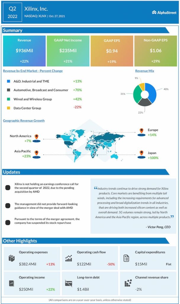 Xilinx, Inc. (NASDAQ: XLNX) reported total revenue of $936 million for the second quarter of 2022, which was up 22% year-over-year.
