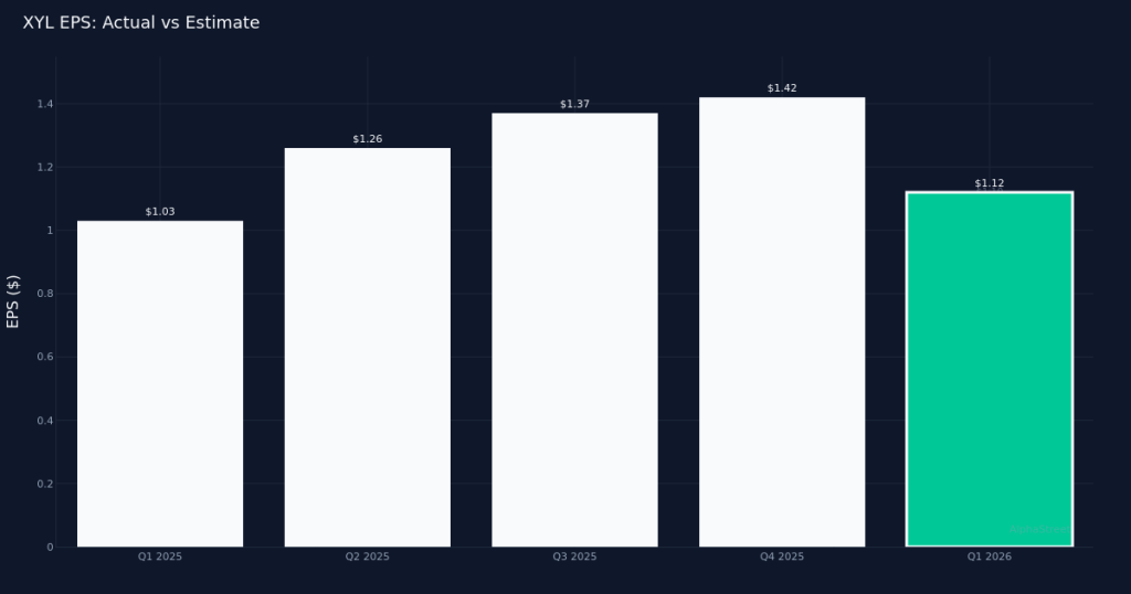 Xylem Inc. reported first-quarter results that edged past Wall Street expectations, with the water technology company posting adjusted earnings of $1.12 per share that beat the $1.10 consensus by 1.8%. Revenue totaled $2.12B for the quarter, up 2.4% from $2.07B in Q1 2025, as the company continued to benefit from global infrastructure investments and water utility modernization projects. Adjusted bottom-line profit came in at $272.0M.