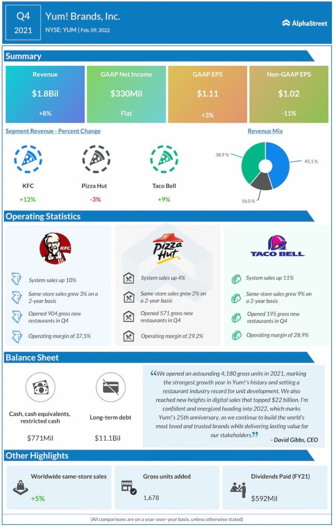Yum! Brands, Inc. (NYSE: YUM) reported fourth quarter 2021 earnings results today.