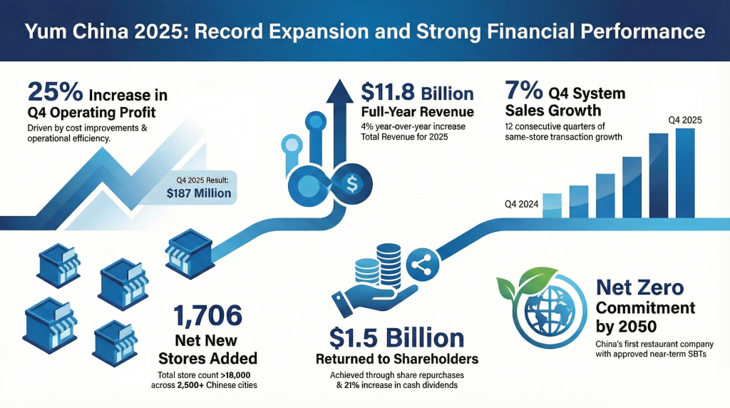Yum China reported total revenues of $2.8 billion for the fourth quarter ended December 31, 2025, a 9% increase year-over-year. Operating profit reached $187 million, a 25% increase compared to the prior-year period, while core operating profit grew 23% to $185 million. Diluted earnings per share (EPS) rose 33% to $0.40. System sales increased 7% excluding foreign exchange impacts, supported by 3% same-store sales growth and a 4% increase in same-store transactions. The restaurant margin expanded by 70 basis points to 13.0%, primarily attributed to efficiencies in food, paper, and occupancy costs. KFC ticket averages remained flat, while Pizza Hut saw an 11% decrease in ticket average.