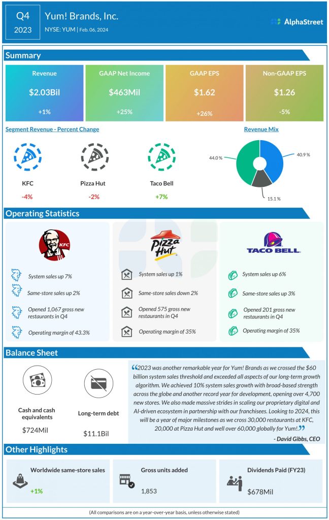 Yum! Brands, Inc. (NYSE: YUM) reported fourth quarter 2023 earnings results today.