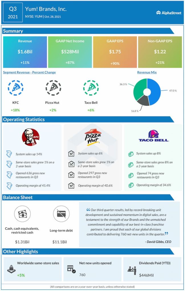 Yum! Brands Inc. (NYSE: YUM) reported third quarter 2021 earnings results today.