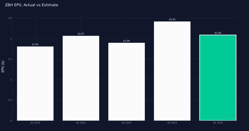 ZBHZBH|EPS $2.09 vs $1.86 est (+12.4%)|Rev $2.09B vs $2.07B est (+0.8%)|Net Income $238.1M