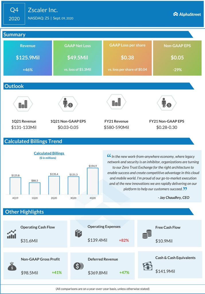 For the first quarter of fiscal 2021, Zscaler expects non-GAAP earnings per share to be approximately $0.05 to $0.06 and revenue in the range of $131 million to $133 million.